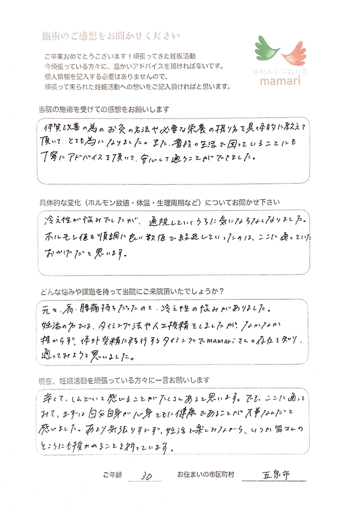 こちらに通い始めてすぐに実感できたことは、基礎体温が安定した事と体の冷えをあまり感じなくなくなった事です。毎回、体の不調を聞いて下さり、それに合わせた施術をしてもらい、本当にありがとうございました。とても親身になって体の様子を聞いて下さり、わからない事は詳しく教えてくれて、毎回、通う事がとても楽しみでした。