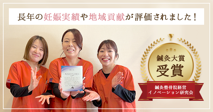 2024年12月、長年の妊娠実績や地域貢献が評価され、東証一部上場の大手企業様より「鍼灸整骨院経営イノベーション研究会 鍼灸大賞」に選ばれました。