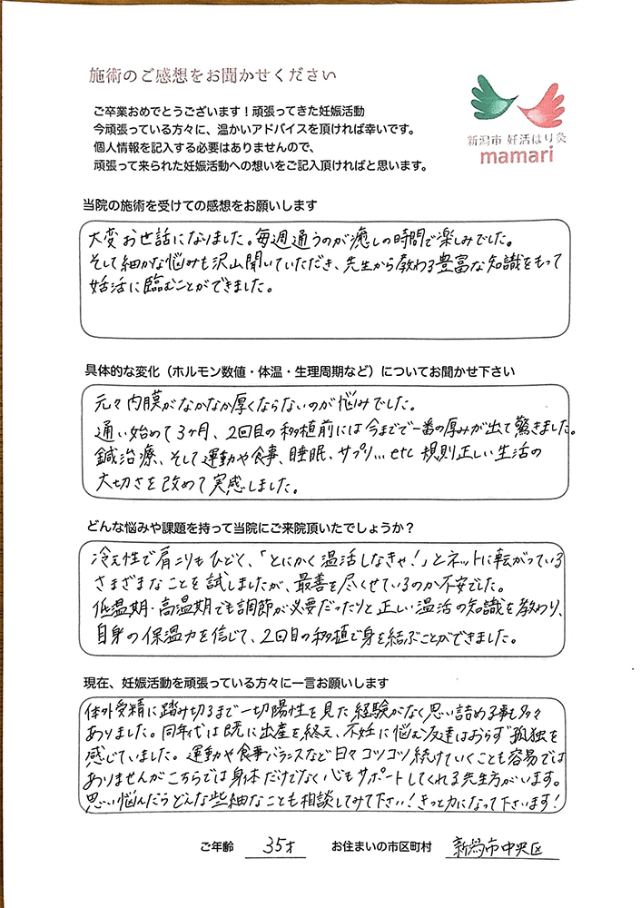 元々内膜が厚くならないのが悩みでした。通い始めて3ヶ月、2回目の移植前には今までで一番の厚みが出て驚きました。鍼治療、そして運動や食事、睡眠、サプリ...etc規則正しい生活の大切さを改めて実感しました。
