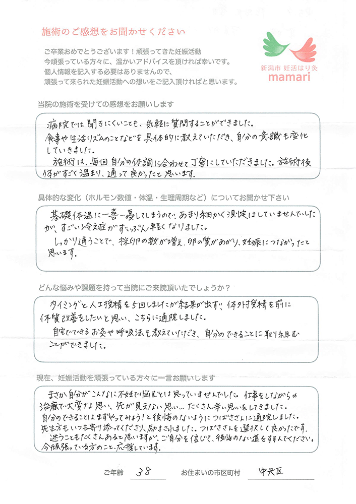 大変お世話になりました。毎週通うのが癒しの時間で楽しみでした。そして細かな悩みも沢山聞いていただき、先生から教わる豊富な知識をもって妊活に臨むことができました。