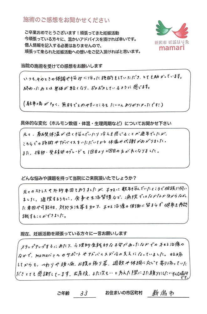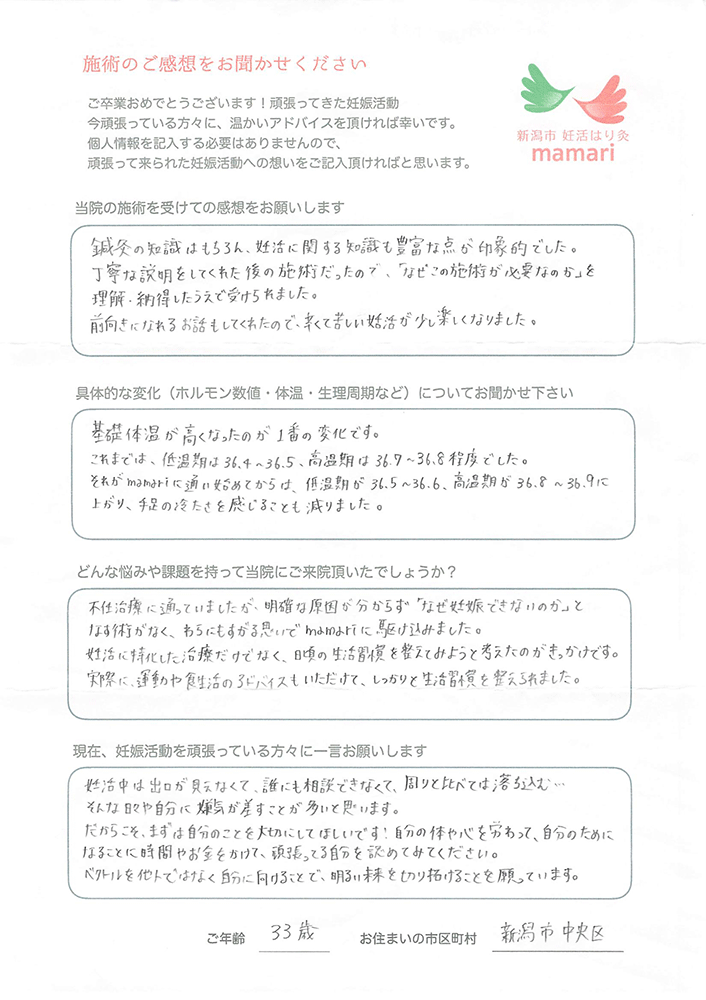 3人目不妊として、一年でも一ヶ月でも早く妊娠したいと思いましたが、不妊外来へ通院では中々出来ず、生活スタイルを変えるためにも何か変わるのでは?とmamariさんへ勇気を出して来院することにしました。