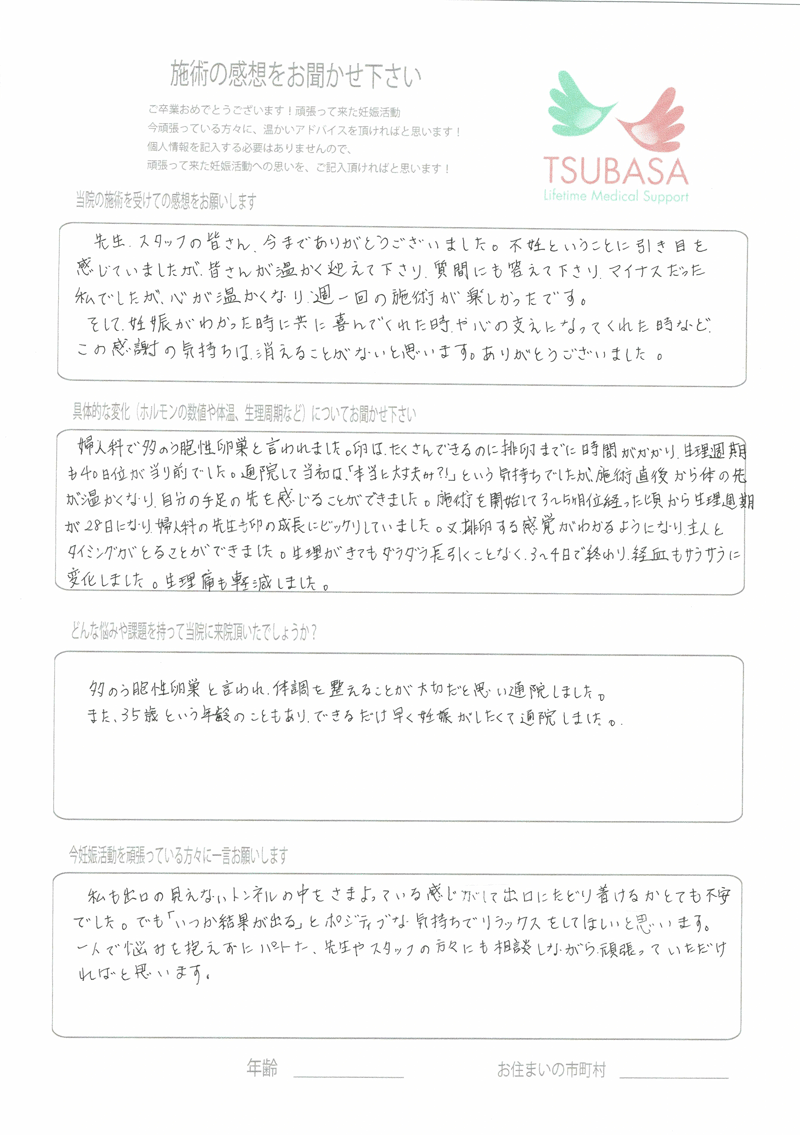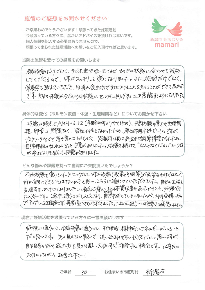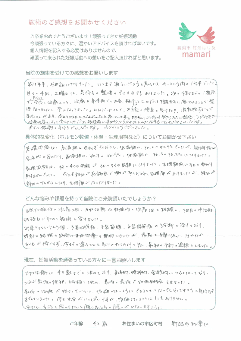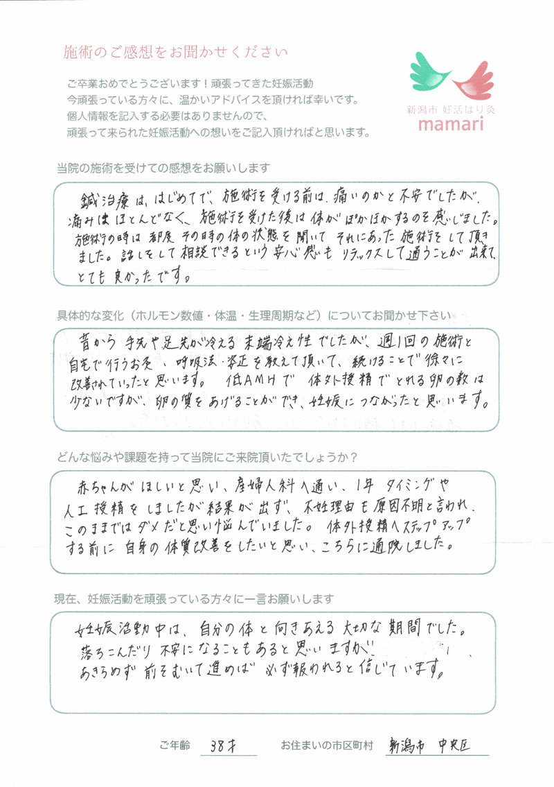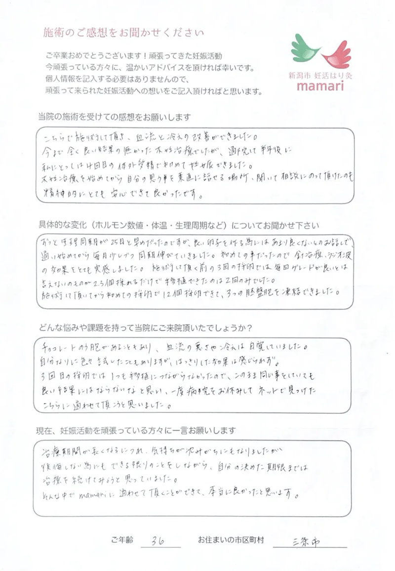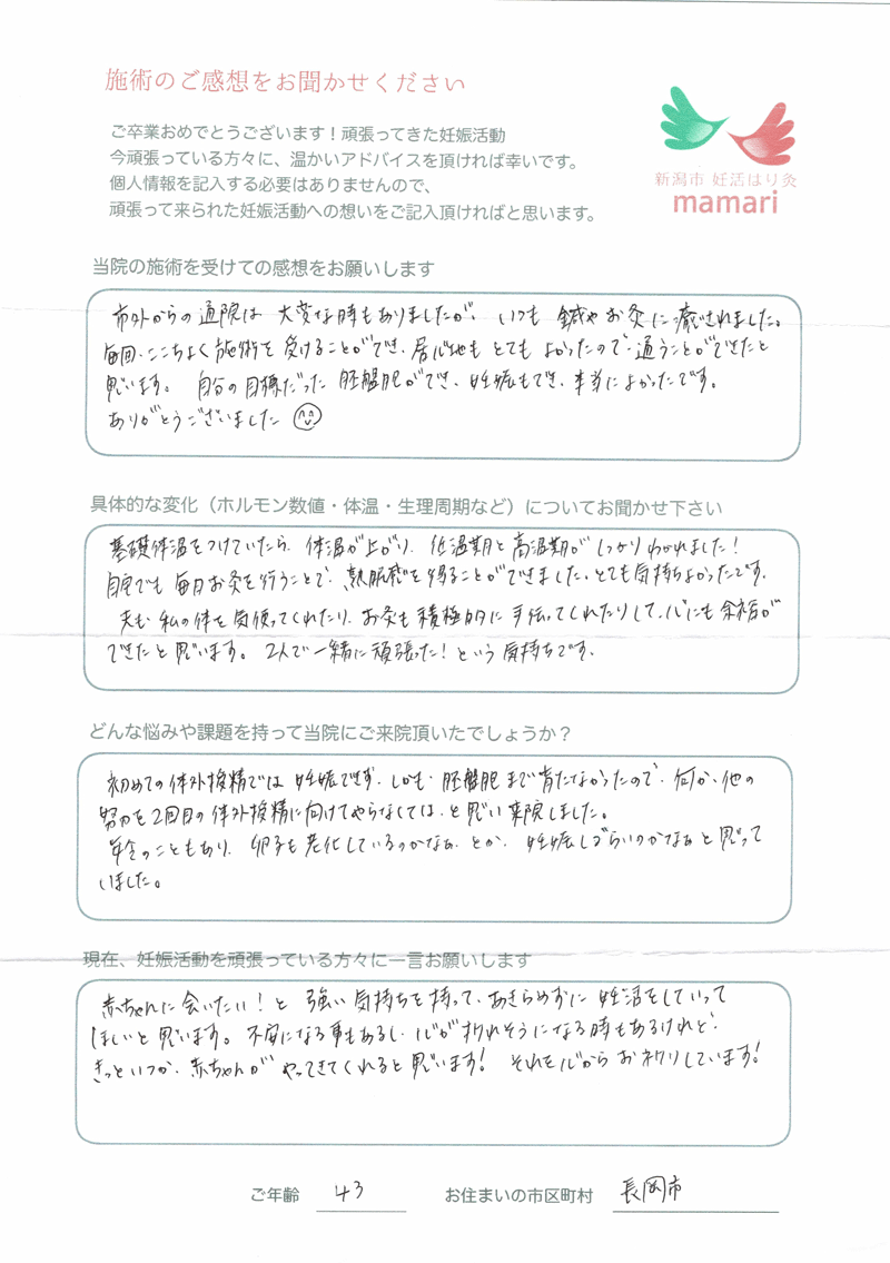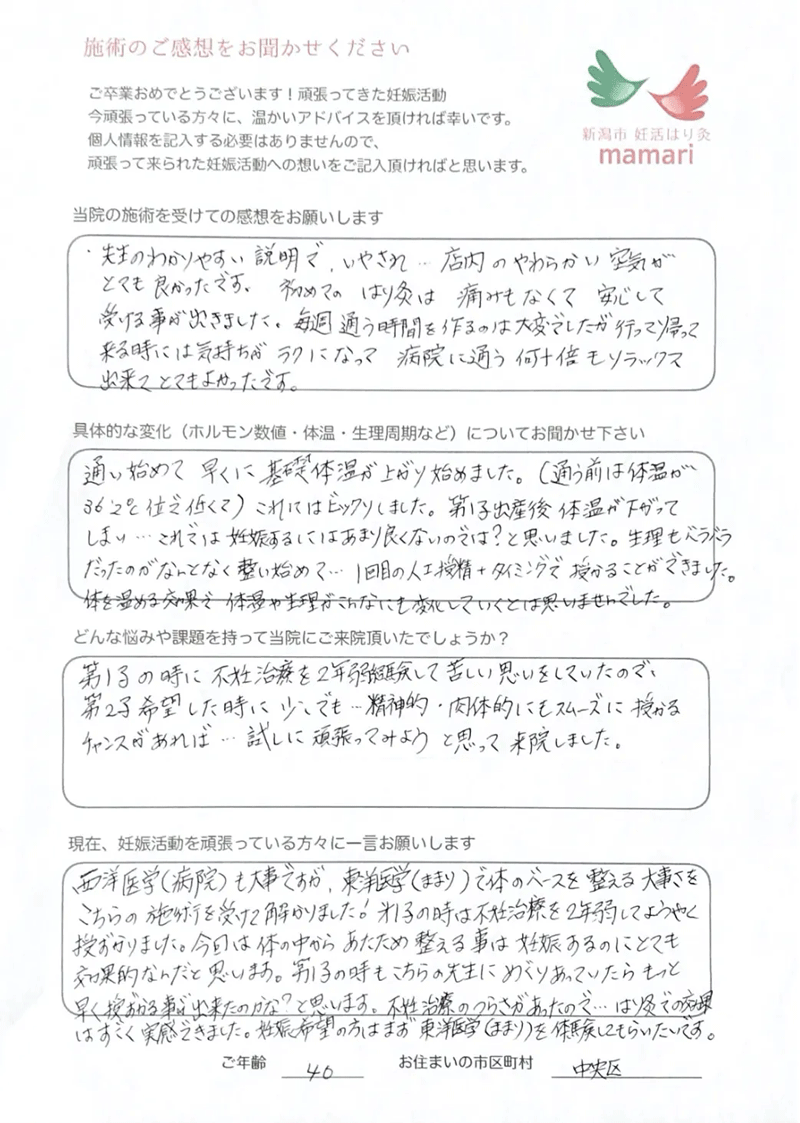 大変お世話になりました。毎週通うのが癒しの時間で楽しみでした。そして細かな悩みも沢山聞いていただき、先生から教わる豊富な知識をもって妊活に臨むことができました。