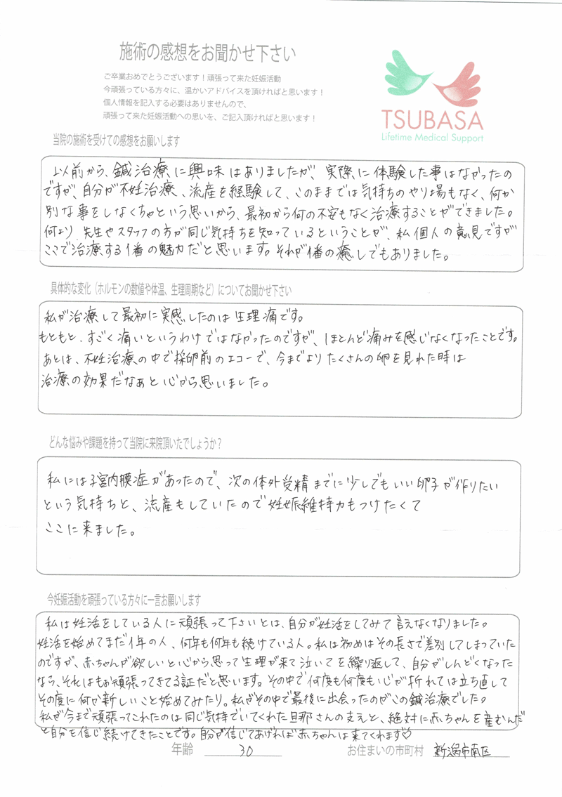 約10ヶ月たいへんお世話になりました。鍼灸はもちろんですが、通院先の病院では得られなかった栄養に関するアドバイスをいただいたり、不妊治療に伴う不安や愚痴をその都度聴いていただいたりしました。それにより鍼灸で体のケアはもちろんのこと、担当の鍼灸師の方に心のケアもしていただいていた様に思います。病院一本だけの治療にしなくて本当に良かったです。貴院の存在が私にとって心強かったです。