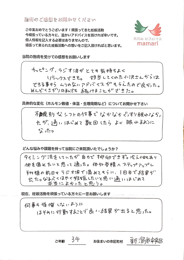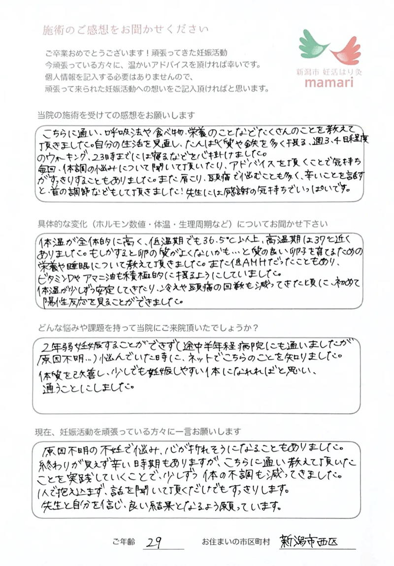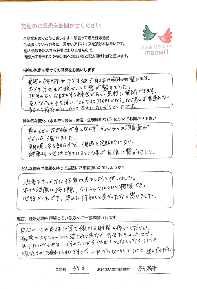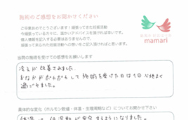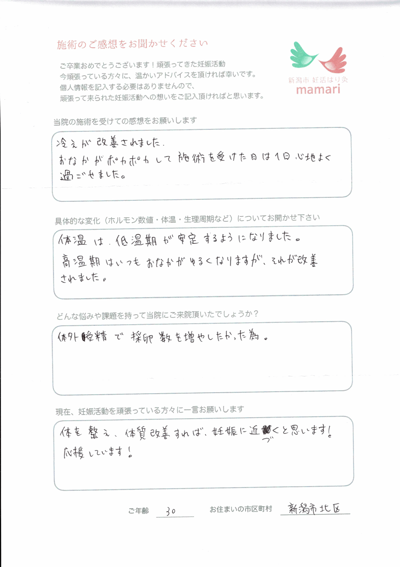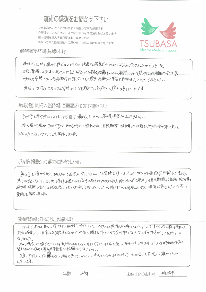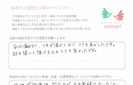 こちらに通い始めてすぐに実感できたことは、基礎体温が安定した事と体の冷えをあまり感じなくなくなった事です。毎回、体の不調を聞いて下さり、それに合わせた施術をしてもらい、本当にありがとうございました。とても親身になって体の様子を聞いて下さり、わからない事は詳しく教えてくれて、毎回、通う事がとても楽しみでした。