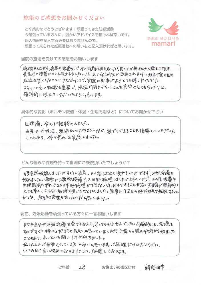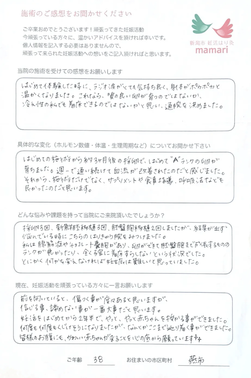 1度自然妊娠しましたがすぐに流産、その後1年近く授かることができず、不妊治療を始めました。最初から顕微授精で、2回胚移植しましたが上手くいかず、その後投薬や生理周期のずれで2ヶ月半胚移植ができない間、何もできることがない期間が精神的にとても辛く、こちらの施術を受けることにしました。無事に3回目の胚移植で妊娠することができ、施術の効果があったんだと思いました。