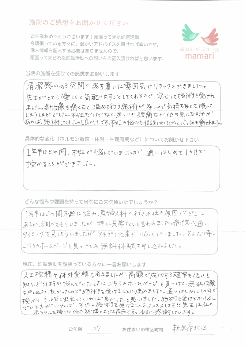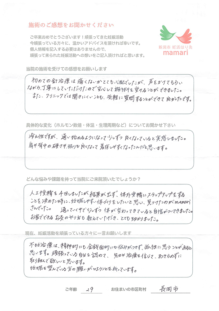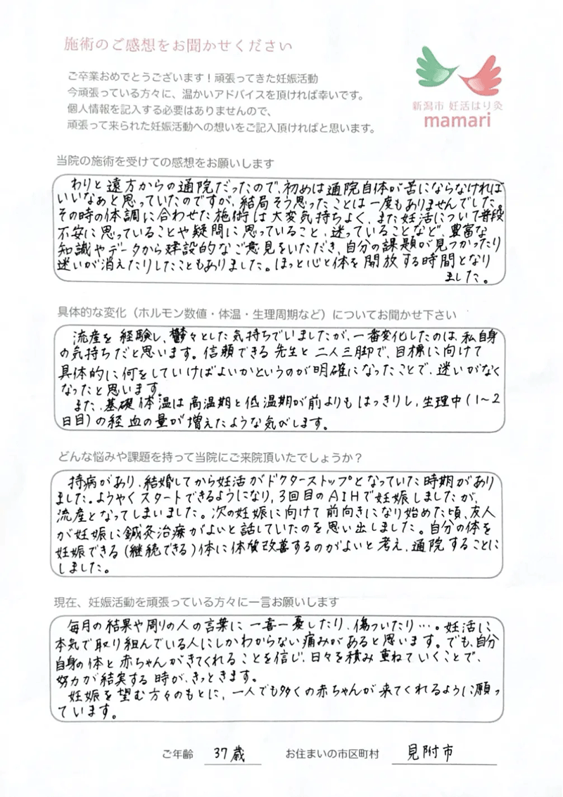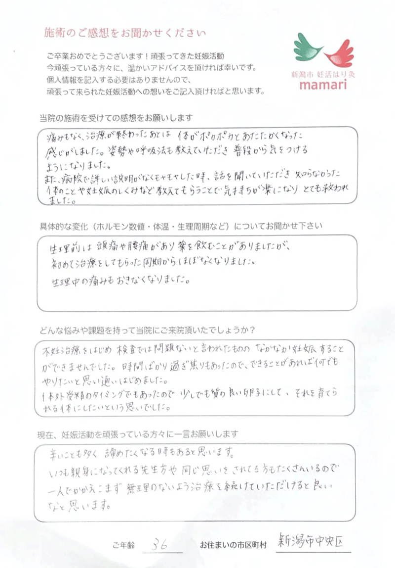 病院は忙しく、なかなか細かい事まで話せなかったのですが、施術中、体のメカニズム・ホルモンと妊娠について、毎回勉強になり、先生には色々と相談できて、安心して通う事ができました。
