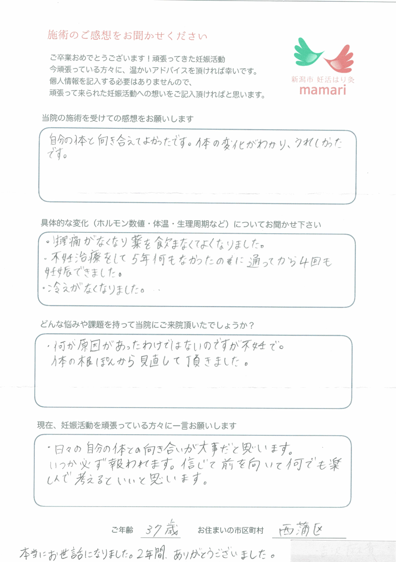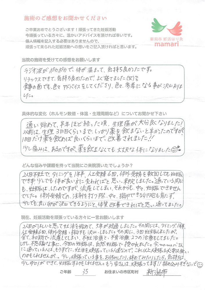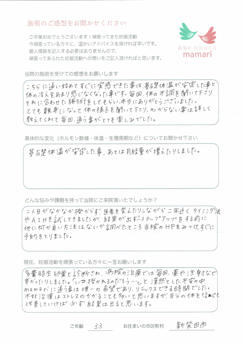 多嚢胞生卵巣と診断され、病院の治療では毎回、薬や注射など辛かったりしました。『いつ授かれるのだろう…。』と漠然とした不安の中、mamariに通う事は、唯一の希望であり、リラックスできる時間でした。不妊治療はストレスのかかる事も多いと思いますが、自分の体を信じて改善していけば、必ず結果は出ると思います。