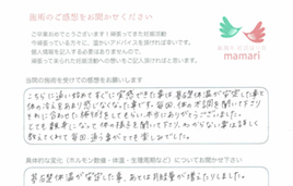 生理痛は、自分としては少し強い時があって薬を飲んだり、経血量も少し少なめになってきたのですが、施術を始めて、通常通り、痛みが楽になり、安定しました。
