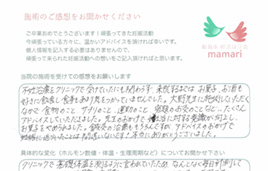 mamariに通わせてもらって、知識を持っている先生と不妊治療のことを話すのが、週1回の楽しみになっていました。リセットすると本当に落ち込みますが、先生とお話すると元気が出ました!!